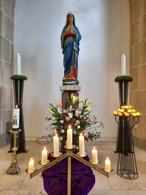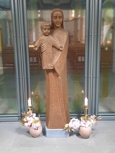 Die aus Holz gestaltete Gottesmutter mit Jesuskind begrüsst nun im Vorraum der Kirche die Gläubigen