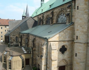 | v.l.: Sakristei, Kirchenschiff (Alter Teil), linkes Seitenschiff mit Hauptschiff und Kirchturm (Neuer Teil) |